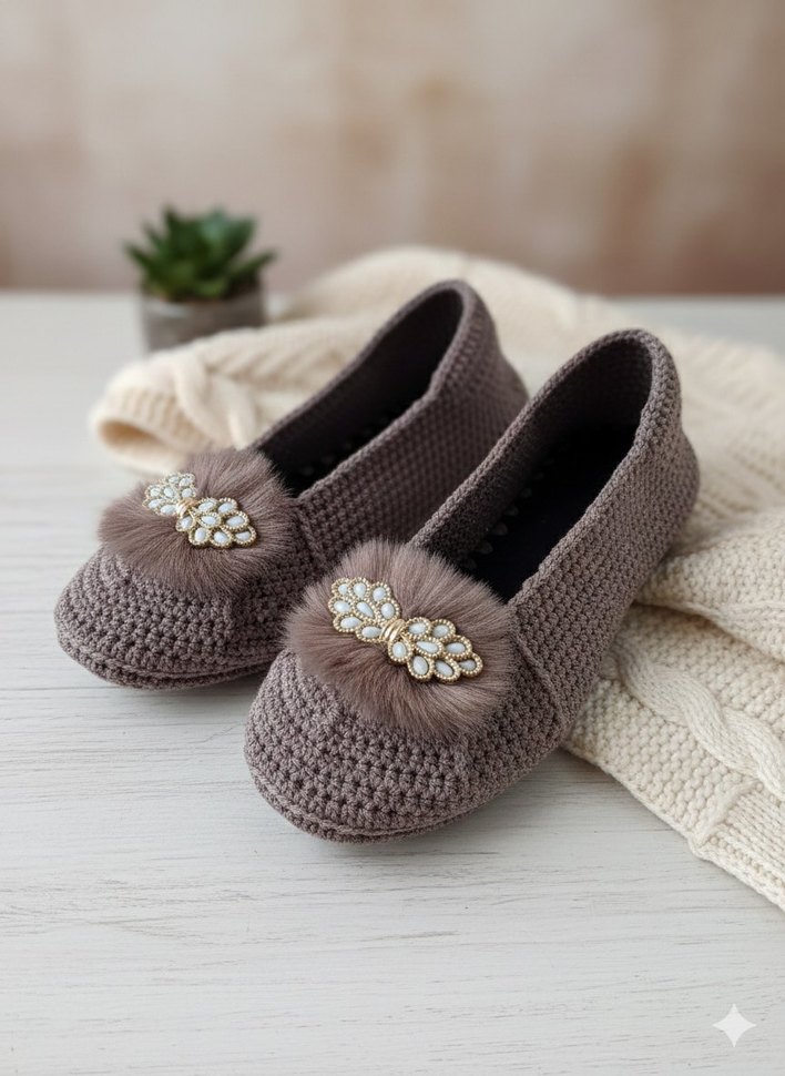 koyu vizon renkte, nakış detaylı örgü kadın ev terliği. Günlük kullanıma uygun, klasik ve rahat bir tasarıma sahiptir. sipariş vermeden lütfen numara belirtelim