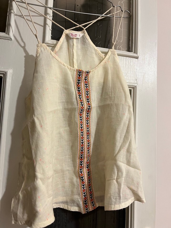 Nakışlı ve boncuk detaylı, askılı bol kesim krem bluz. Yumuşak kumaştan, günlük kullanım için uygun.