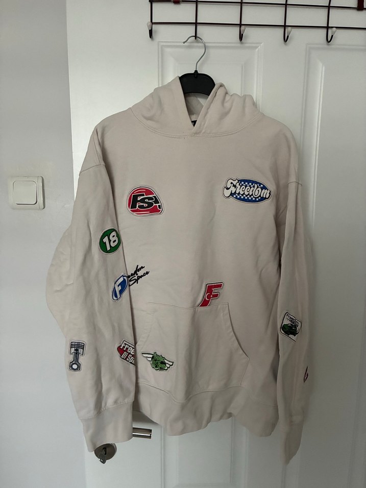 Krem renkte, nakışlı ve düğmeli, uzun kollu, yuvarlak yakalı, bol kesim erkek sweatshirt. Rahat ve sıcak kumaştan, günlük kullanım için uygundur.