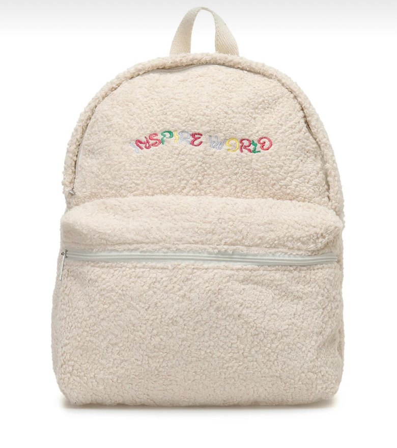 Yumuşak dokulu krem kadın sırt çantası, önünde pastel renklerde nakışlı detaylar bulunmaktadır. Önde fermuarlı cep ve taşıma kulpu vardır.
