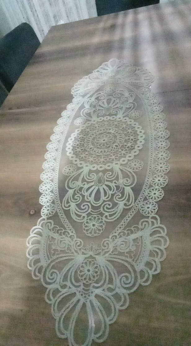 Nakışlı desenlere sahip beyaz masa örtüsü, geleneksel tarzda şık bir görünüm sunar. ölçü en 38boy104