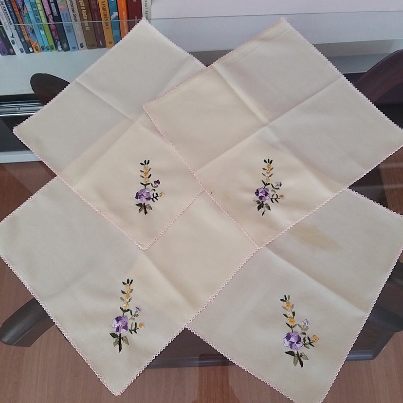 Nakışlı, mor ve pastel renklerde, geleneksel tarzda krem renk peçeteler , zarif çiçek desenleriyle süslenmiş. 4 adettir . Kahvelerin yanına güzel detay Bazı yerlerinde sandık lekesi var yıkayınca geçecektir .