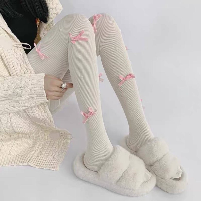 Nakışlı pembe fiyonk detaylı, krem triko midi tayt. Rahat ve şık, günlük kullanım için uygundur.