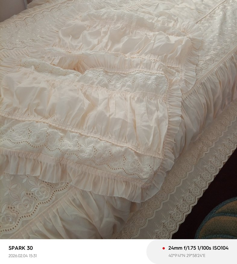 150x160 cm Nakışlı desenlere ve yumuşak fırfırlı kenarlara sahip krem yatak örtüsü. Pastel tonlar şıklık katıyor. ️