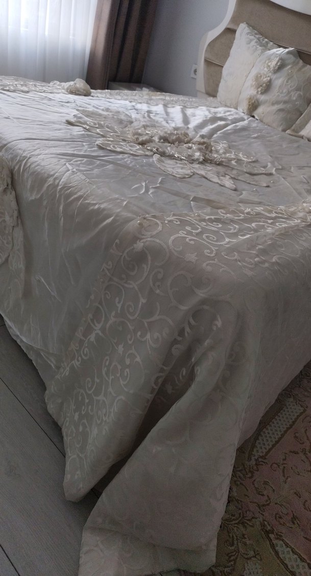 uzun süre kullanılmadığı için sararmalar var yıkayınca geçebilir iki yastık fermuarı bozuk bi iki yerde üstteki dantel alttaki satenden ayrılmış ama dikilebilir kullanılabilir. süs olarak kullanılan perdesi de hediyedir