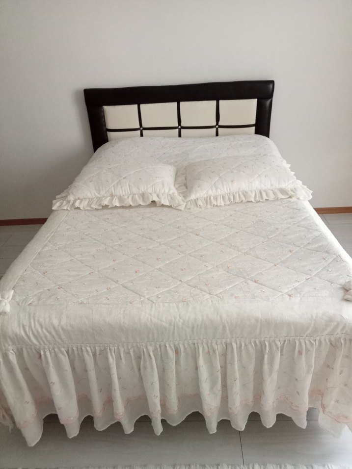 Nakışlı detaylara ve fırfırlı kenarlara sahip krem yatak örtüsü. Hafif ve zarif tasarım yatak odasına şıklık katıyor. ️Kullanıldı..Etek kısmında ufak pürüzü mevcut Terzide düzeltilebilir yada kendiniz yaparsınız Fiyata yansıtıyorum