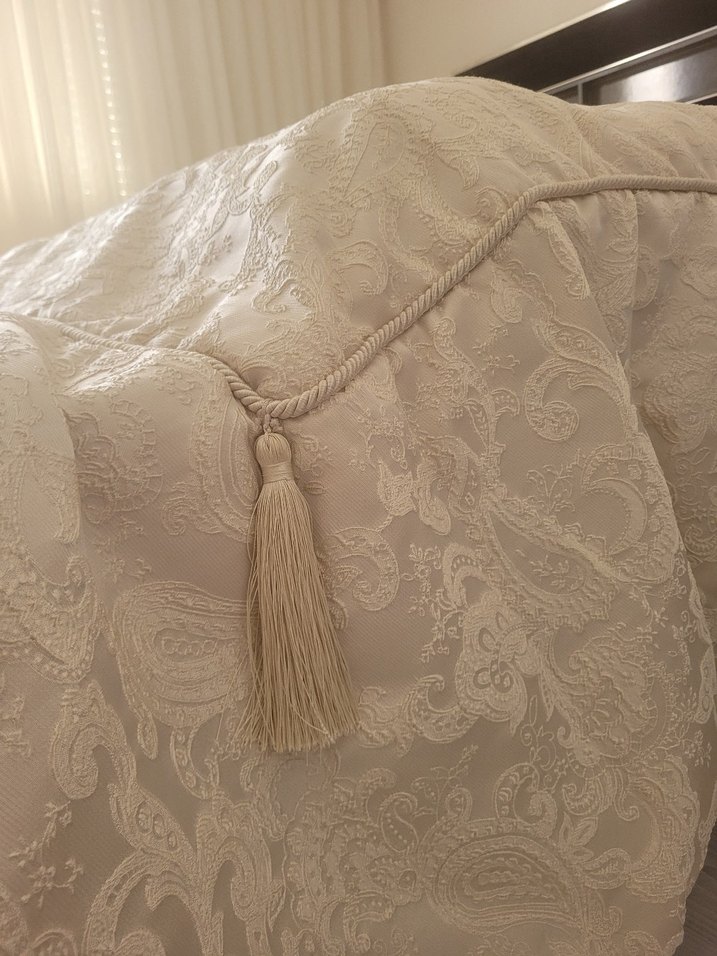 İnce nakışlı desenlere ve dekoratif püsküllere sahip krem yatak örtüsü, yatak odasına klasik bir dokunuş katıyor. ️