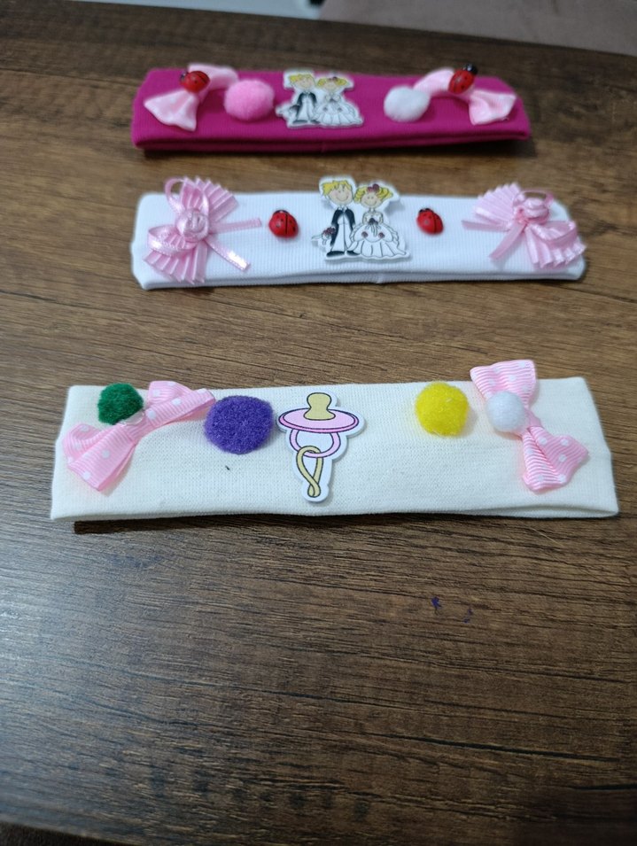 Nakışlı desenler, kurdeleler ve renkli ponponlarla süslenmiş pastel pembe ve beyaz saç bantları seti. Çocuklar için modaya uygun ve eğlenceli tarz. 3 adet