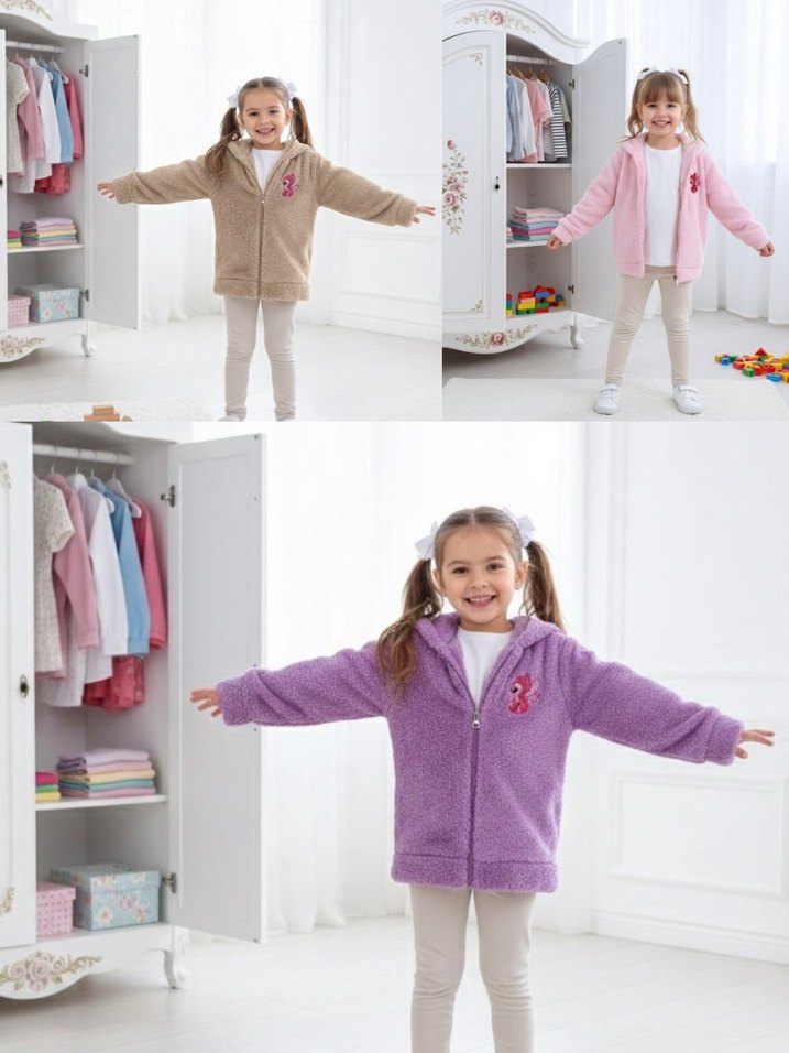 Uzun kollu, bol kesim kız çocuk polar hırka, nakış ve kürk detaylarıyla bej, pembe ve mor renk seçeneklerinde sunuluyor. 2-3 7-8 yaş arası bedenler. İstenilen renk ve beden için ilan açtırınız.