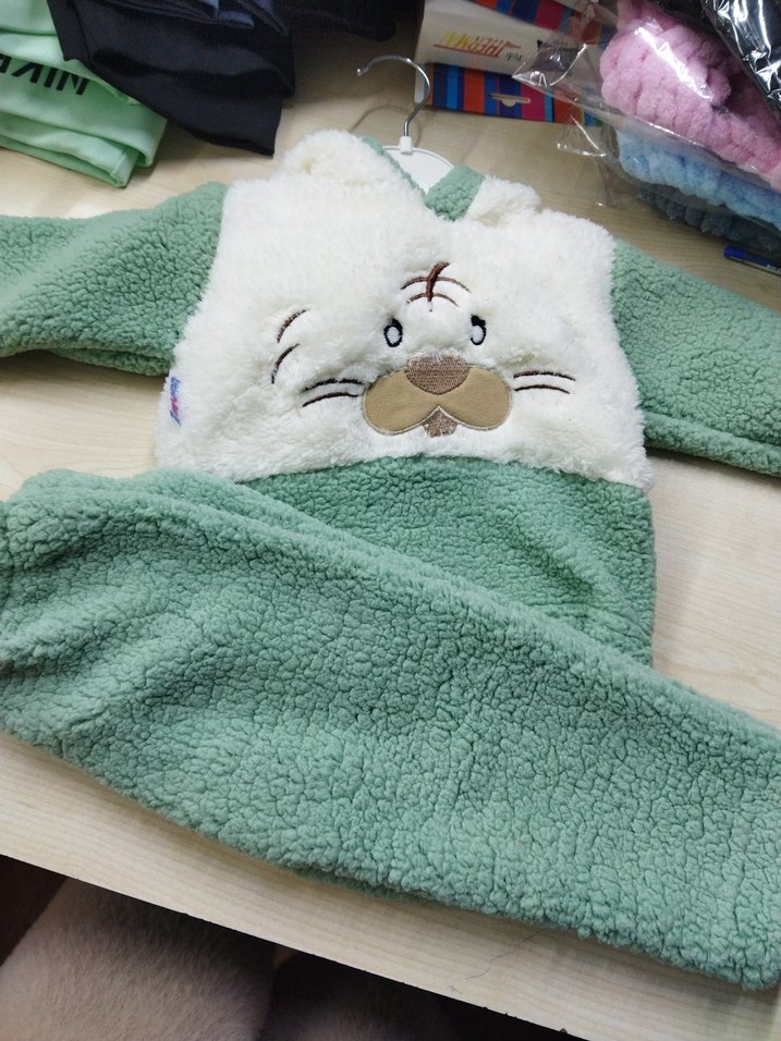Nakışlı detaylara sahip yumuşak kürk kumaştan renkli yeşil kedi desenli takım rahatlık ve normcore tarzı bir arada sunar.