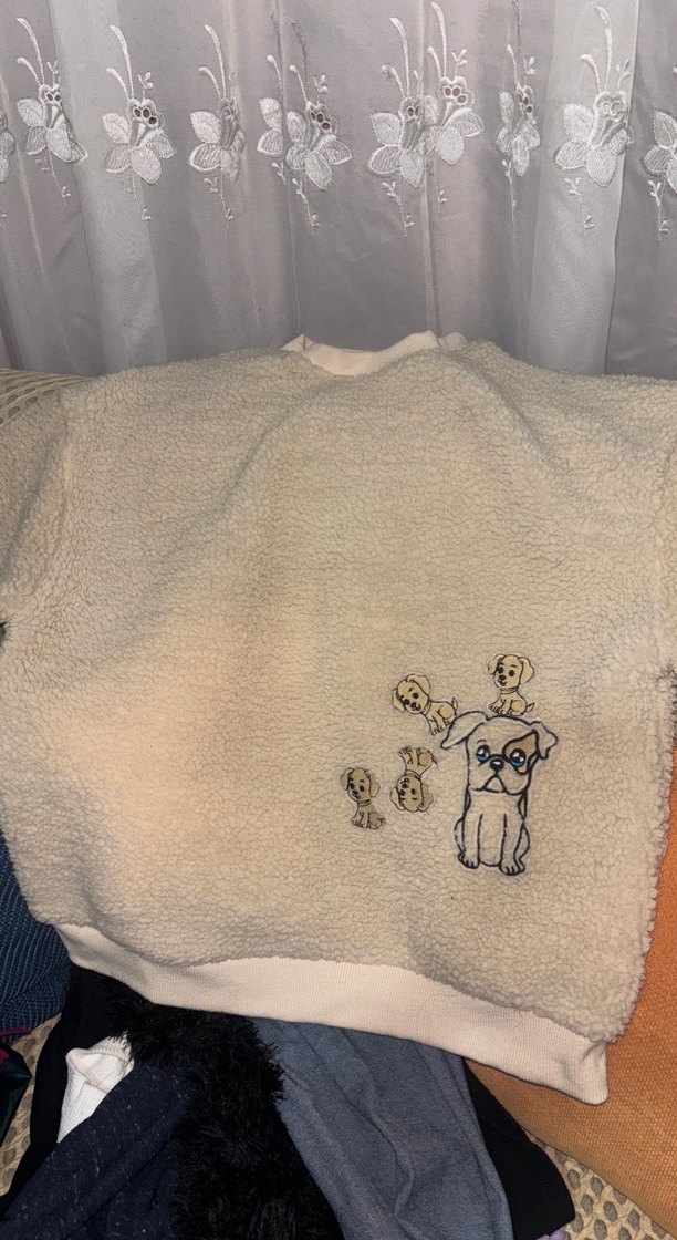 Pastel bej renkte, yumuşak kürklü ve nakışlı yavru köpek desenli sokak stili köpekli kadın kazak