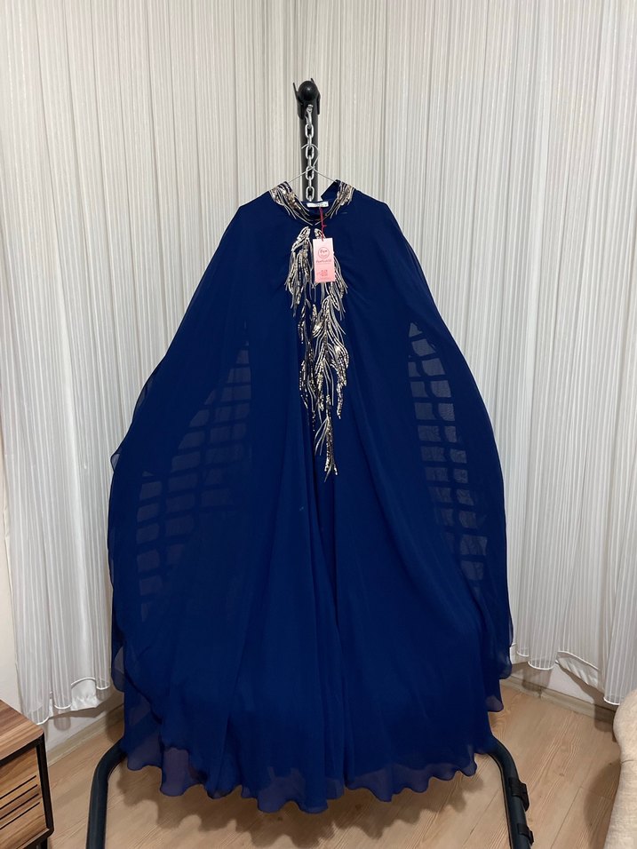 Nakışlı desenlere sahip, yüksek yakalı ve bol kesimli lacivert uzun elbise. Drapeli ve askılı kollarıyla bohem ve avangart tarzda parti için uygun.