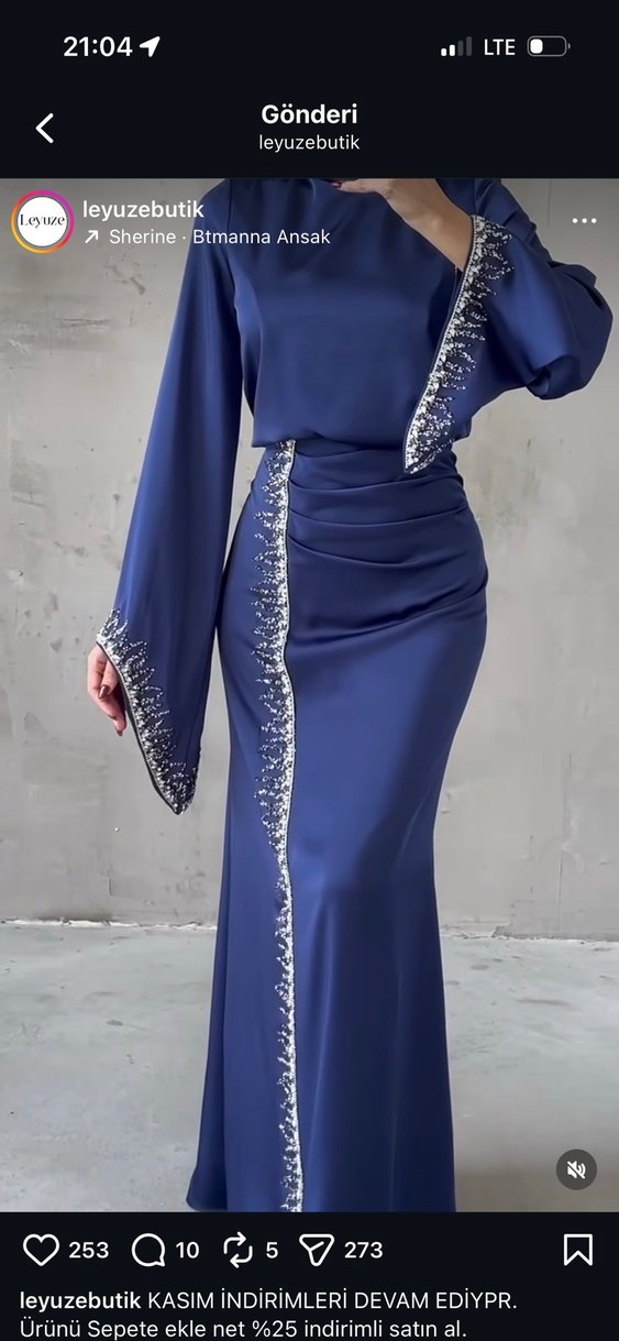 Lacivert uzun abiye elbise, drapeli ve vücuda oturan kesimle. Nakış detayları, V yaka ve uzun kollu, düğünler için uygun. ✨