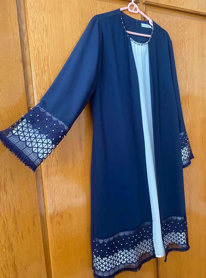 Bu ipeksi lacivert nakışlı detaylara sahip, drapeli ve modest yaka ile uzun kolludur, ofis kullanımı için uygundur. 2 kere düğün için giyildi -- FİYAT SONDUR LÜTFEN ISRAR ETMEYİNİZ