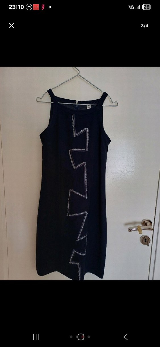 Lacivert, kolsuz, nakışlı ve yırtmaçlı elbise. Düzenli kesimle gotik ve şık bir görünüm sunar.