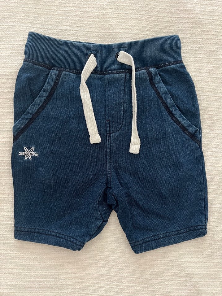 Erkekler için düğmeli ön, nakış detaylı, bağcıklı bel bandına sahip lacivert fitted denim şort. Sokak tarzı için uygun.