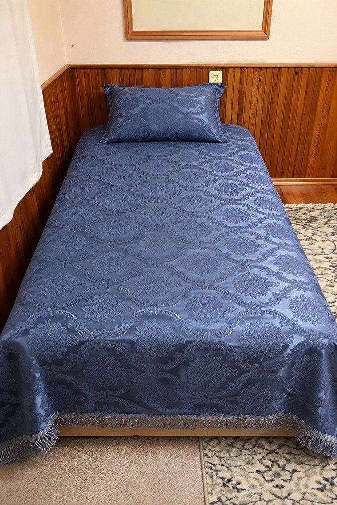 Nakışlı desenlere sahip lacivert yatak örtüsü, gri detaylarla zarif bir dokunuş sunar. Püsküllü kenarları ve uyumlu yastık kılıfı ile tamamlanmıştır. ️