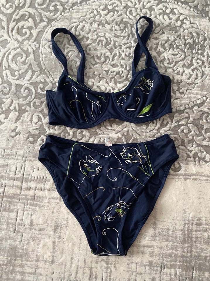 Nakışlı çiçek desenli, dantelli ve askılı lacivert kadın bikini takımı. Vücuda oturan kesimiyle plajda dikkat çeker. Y2k.