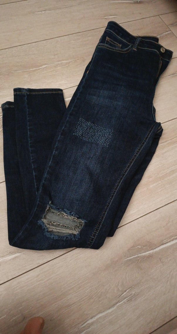Nakışlı detaylara ve tokalı tasarıma sahip, dar kesim lacivert kot pantolon. Normal boy midi stiliyle gündelik kullanıma uygun, trend normcore tarzı jeans.