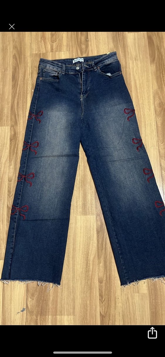Nakışlı fiyonk detaylı lacivert kot pantolon, normal boy ve regular fit kesim, günlük rahat sokak stili için uygundur. esnek bir kuması var cok kullanmadım 2 3 kere falan giymişimdir. fotografta durdugundan biraz daha eskitme bir rengi var