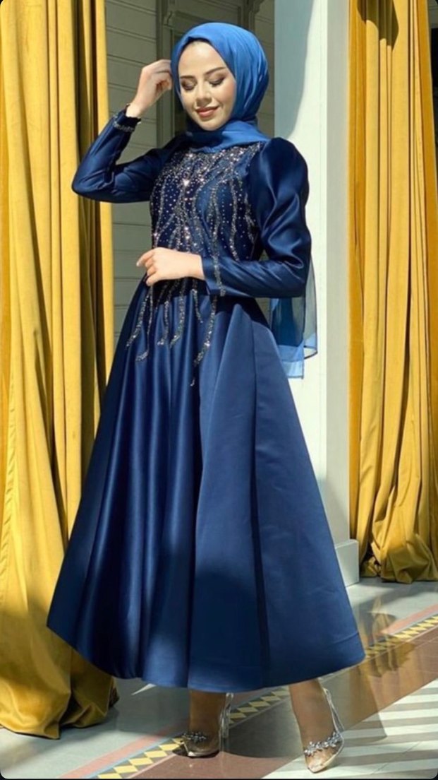 Nakış işlemeli, uzun kollu ve yüksek yakalı lacivert abiye elbise, drapeli kesimiyle mütevazı ve şık bir görünüm sunar. Düğünler için uygun.