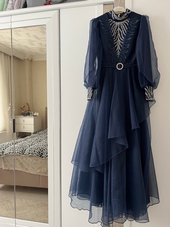 Nakışlı desenlere ve yüksek yakaya sahip lacivert uzun abiye elbise, drapeli tasarımı ve ince askılı kollarıyla düğünler için uygun, bol kesim.sadece nişanımda giydim