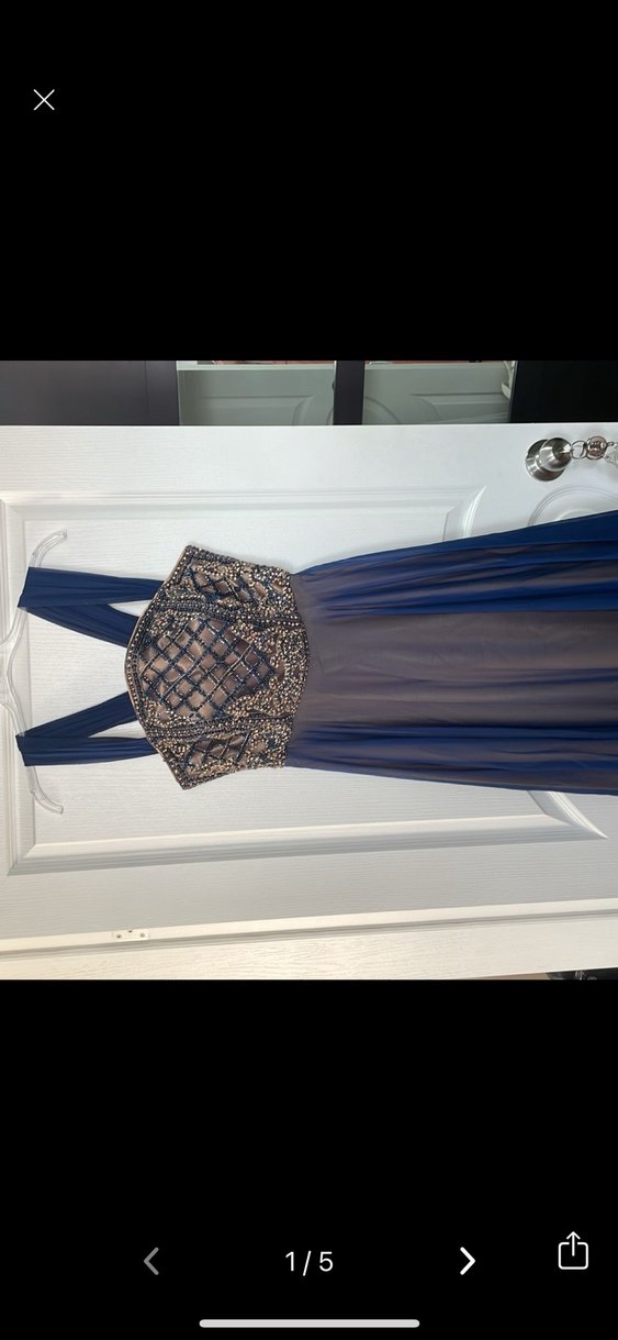 Lacivert renkli, askılı ve drapeli uzun abiye elbise, nakış detaylarıyla süslü. Bohem tarzı ve klasik zarafeti bir arada sunar. Sadece nişanda 1 kez giyildi. Tacı da var.