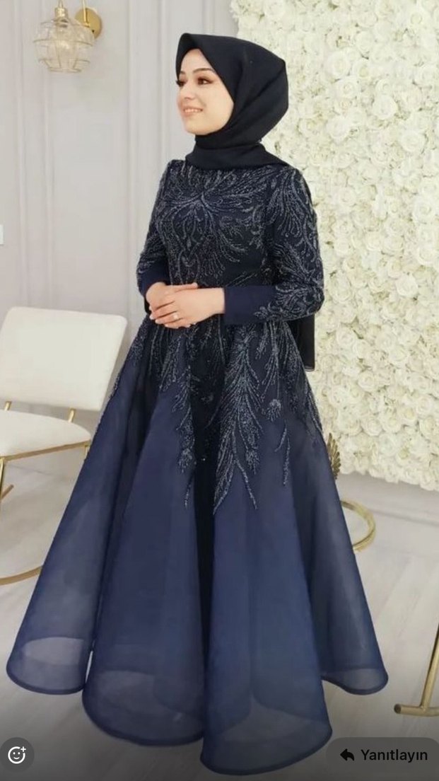 Lacivert renkli, yüksek yakalı ve uzun kollu bu uzun abiye elbise, nakışlı detaylara sahiptir. Düzenli kesim ve drapeli etek ile mütevazı ve göz alıcı bir şıklık sunar. 2500₺ satılık