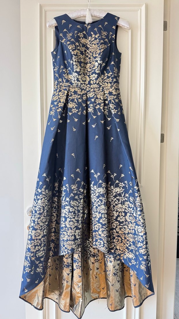 Nakışlı detaylara sahip, straplez yaka ve kolsuz, lacivert uzun abiye elbise. Drapeli etek vintage esintili, düğünler için uygun. Az kullanılmış ve defosu yoktur. 38-40 bedene rahatlıkla olur. İlgilenenlerle en/boy bilgisi paylaşabilirim.