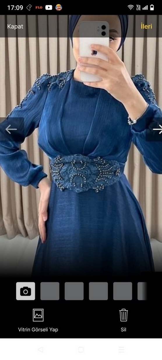 Lacivert uzun abiye elbise, uzun kollu ve V yakalıdır. Nakış detayları ve kemeriyle klasik ve şık bir görünüm sunar. 3saat giyndm sadece ,omuzdan kol kısmı işlemelerle süslüdr