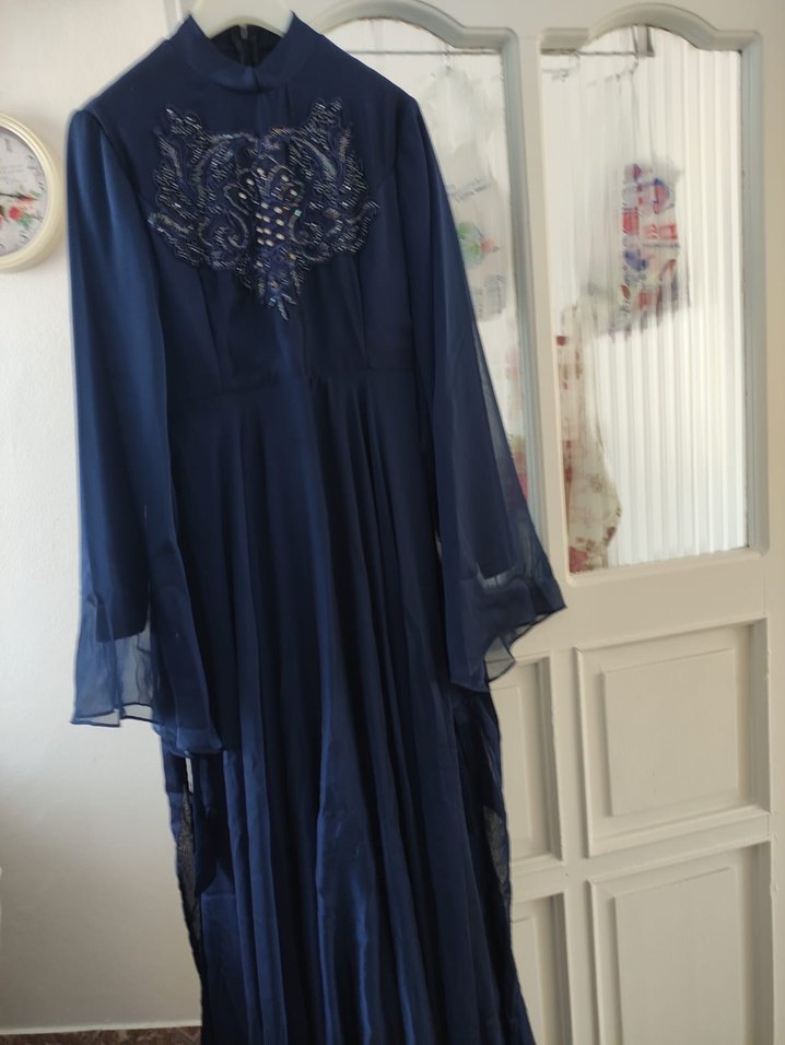 Lacivert renkte, yüksek yakalı ve uzun kollu, nakış detaylı uzun abiye elbise. Salaş ve drapeli kesimiyle modest stil ve düğünler için uygundur.