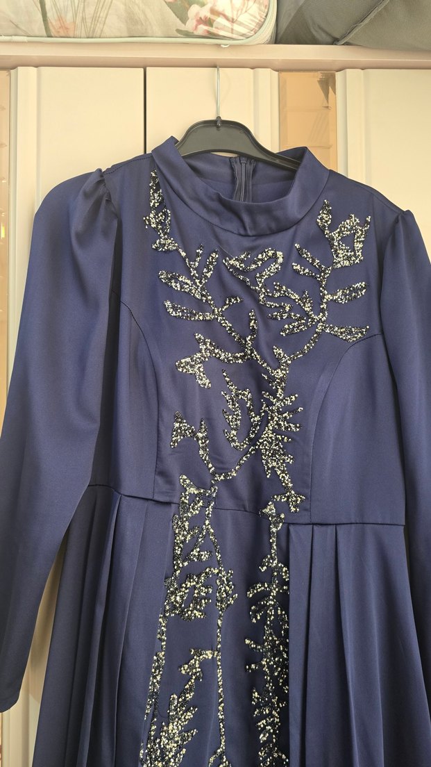 Lacivert, uzun kollu, yüksek yakalı, vücuda oturan, parlak nakışlı ve drapeli abiye elbise, düğün için uygundur.