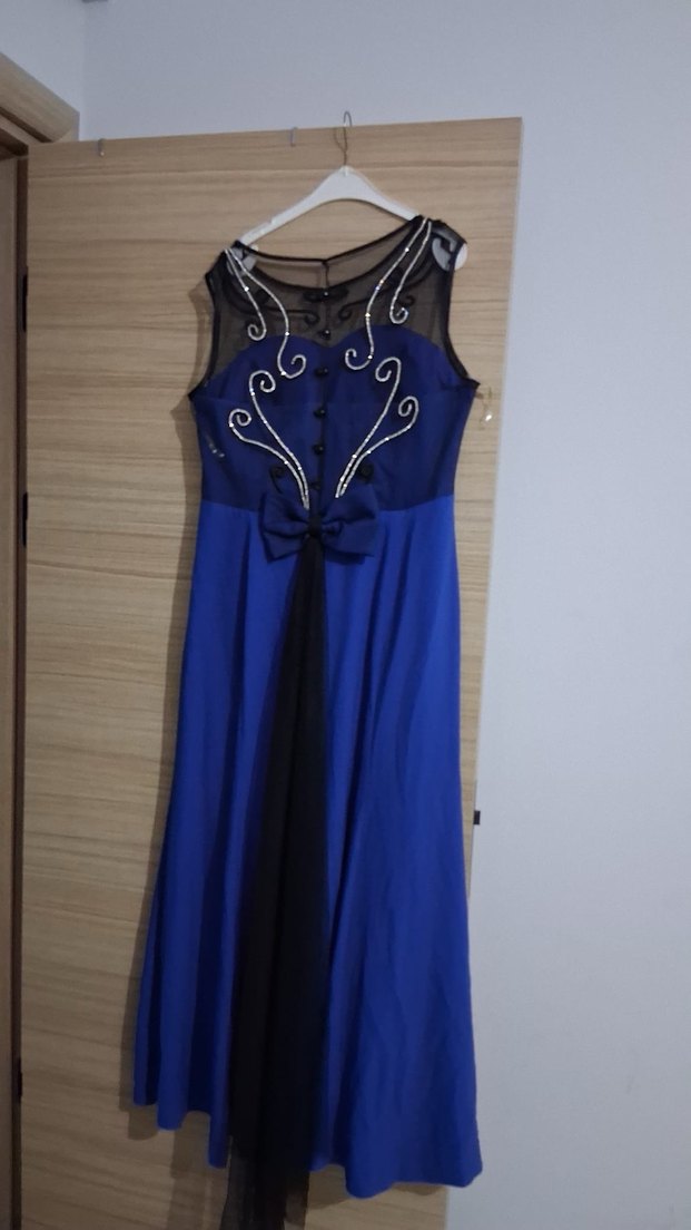 Bu koyu lacivert uzun abiye elbise, nakışlı desenlere ve drapeli tasarıma sahiptir. Kolsuz, askısız ve normal kesimlidir, düğün için uygundur. Goth tarzı ile vintage zarafeti birleşir.