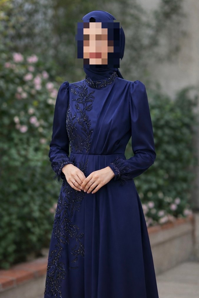 Yüksek yakalı, uzun kollu ve drapeli detaylara sahip dar kesim lacivert abiye elbise. Nakışlı kumaşı düğünler için uygundur. Yeni üründür. 36/38 bedenlerin tercihi olmalıdır.