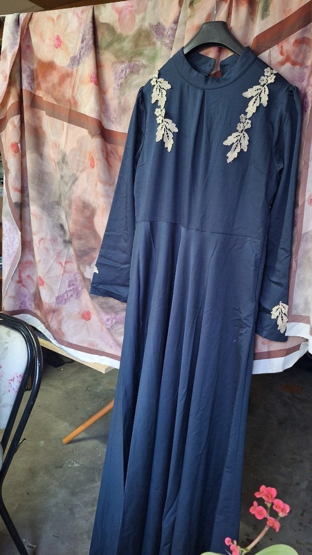 Lacivert uzun elbise, yüksek yakalı ve uzun kolludur. Nakış detayları ve dökümlü tasarımıyla sentetik kumaştan yapılmıştır, sade ve bohem tarzda.