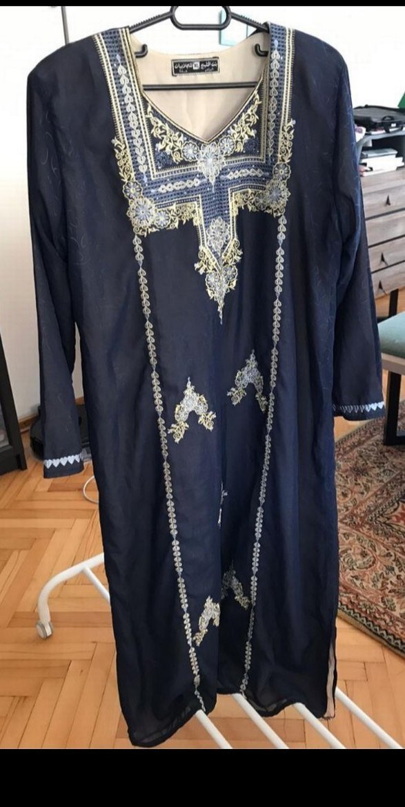 Drapeli uzun kollu, nakışlı detaylara sahip bol kesim lacivert uzun elbise. İpek gibi kumaştan, yakası notched lapel. Düğünler için uygun. XL beden kına elbisesi yurt dışından vintage
