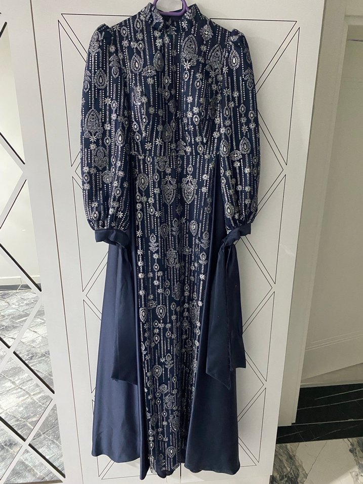Lacivert uzun elbise, nakış ve zincir detaylarına sahiptir. Yüksek yaka, askılı kollar ve klasik kesimle vintage ve sade bir görünüm sunar.