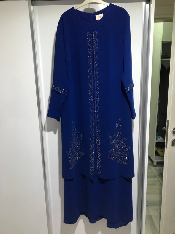 Lacivert uzun elbise, uzun kollu ve nakışlı detaylara sahip. Notched lapel yakalı, regular fit ve dökümlü tasarımlı, sentetik kumaştan üretilmiştir. Düğün gibi mütevazı etkinlikler için uygun.