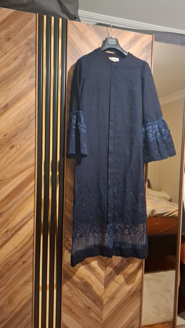 Lacivert uzun keten elbise, uzun kollu ve drapeli nakışlı detaylara sahip, notched lapel yakalı ve rahat kesimlidir. Kent Marka stildir.