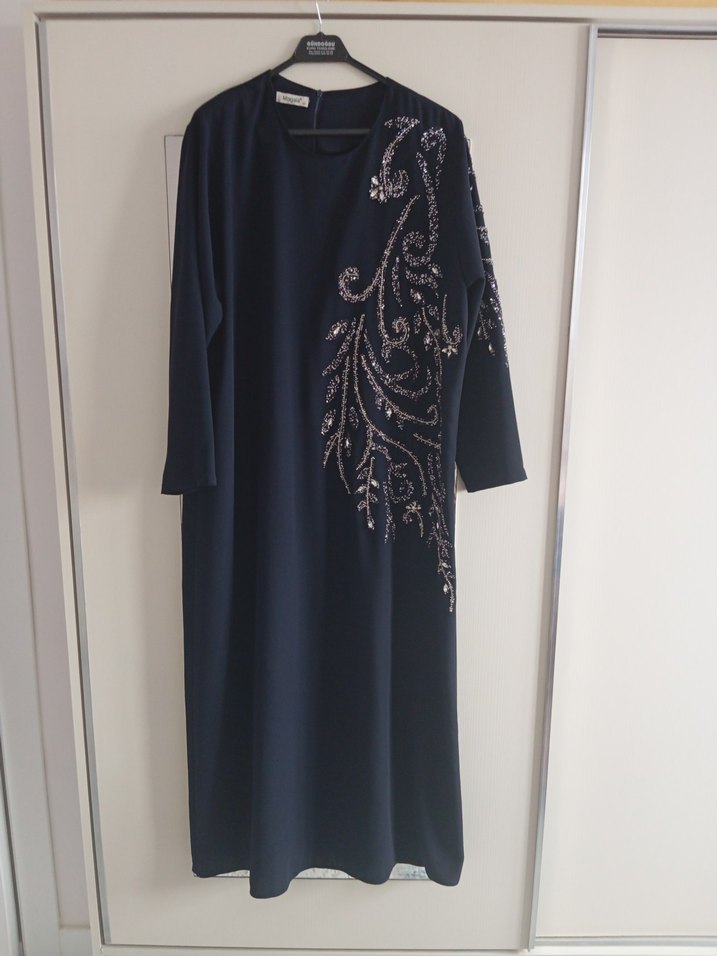 Lacivert, uzun kollu, salaş kesim elbise, yuvarlak yaka ve drapeli detaylara sahiptir. Nakışlı desenlerle bohem krep kumaş kullanılmıştır.