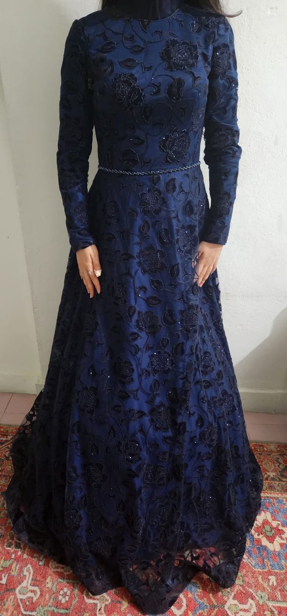 Lacivert uzun kollu abiye, tekne yaka ve nakışlı detaylarla klasik şıklık sunar. Dökümlü ve regular fit kesimle düğünlere uygun.
