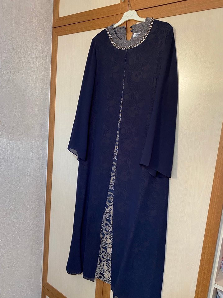 Bu lacivert uzun elbise yüksek yakalı, uzun kollu ve nakışlı desene sahiptir. Dökümlü tasarımı ve klasik vintage tarzıyla düğünler için uygundur.