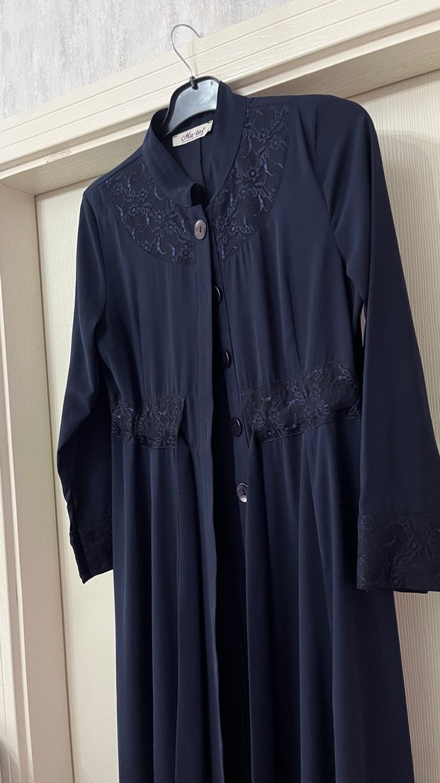 Lacivert, nakışlı, düğmeli ve uzun kollu, notalı yaka detaylı, bol kesim, ipeksi kumaştan kadın uzun elbise.