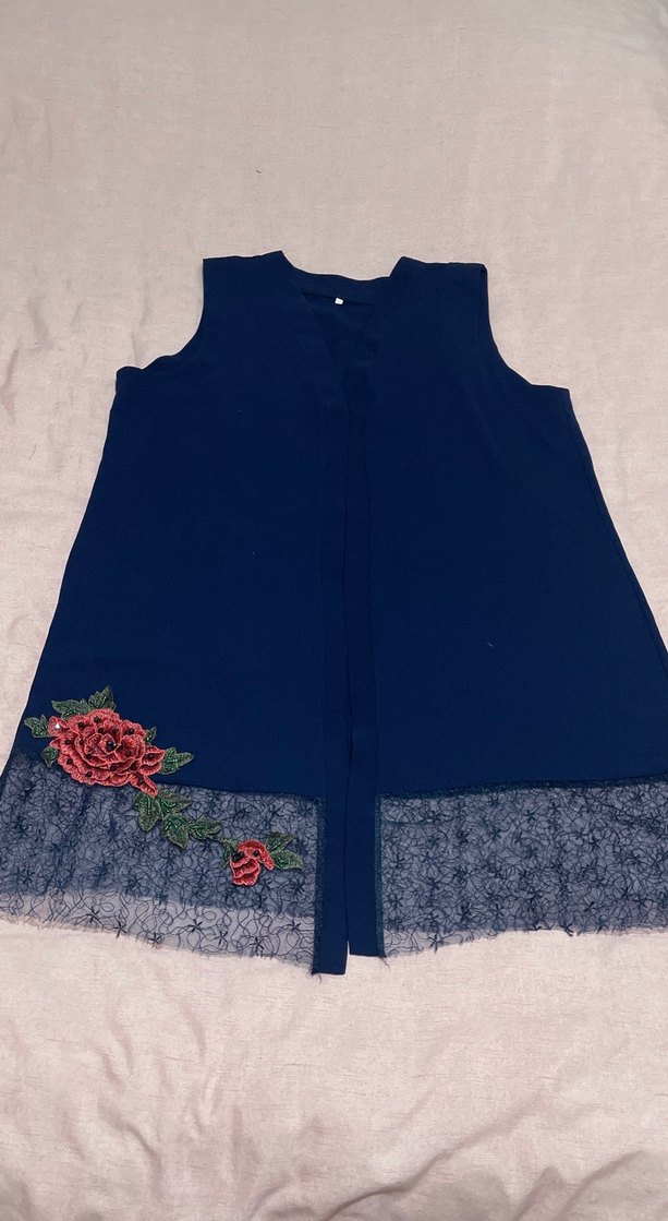 Lacivert, kolsuz, V yaka uzun tunik. Nakışlı çiçek desenleri ve fırfır detaylarıyla bohem, rahat bir tarz sunar. 52-54 bedene çok rahat olur