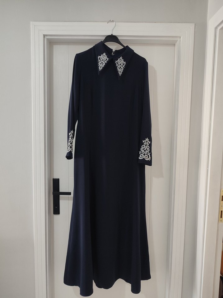 Lacivert uzun elbise, yüksek yaka ve uzun kollu, yakada ve manşetlerde nakış detaylıdır. Dökümlü, ipeksi kumaş ve rahat kesime sahiptir, özel gunlerde yakınınızın nişan düğüne uygundur.