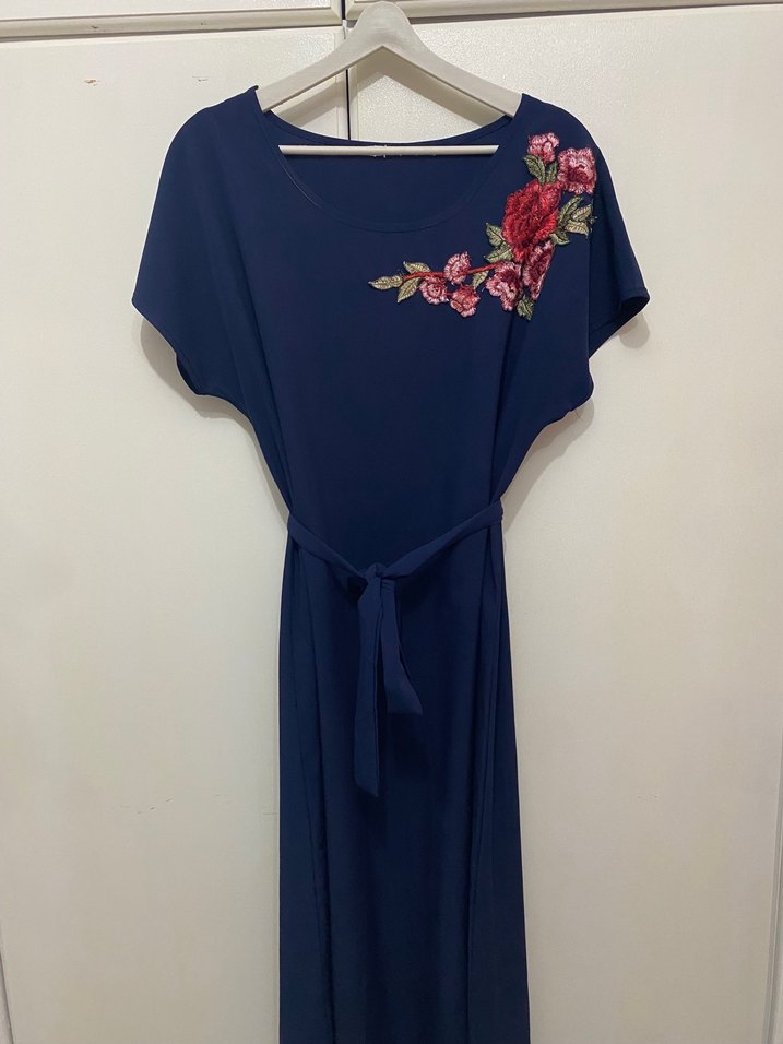 Lacivert renkli, kısa kollu, yuvarlak yakalı, nakışlı, bol kesim uzun yazlık Elbisedir. Belden bağlamalıdır.