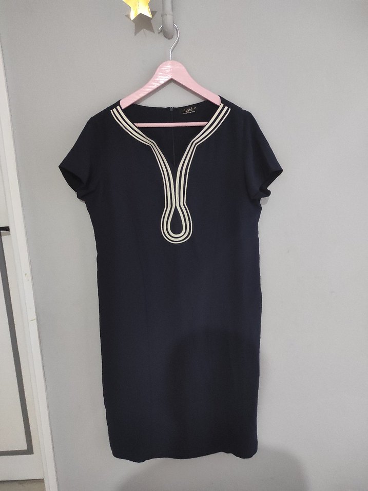 Lacivert midi elbise, V yaka ve kısa kollu. Renkli nakış detayları ve kemerli bel ile regular kesim. Sentetik kumaştan, günlük sokak stiline uygun.