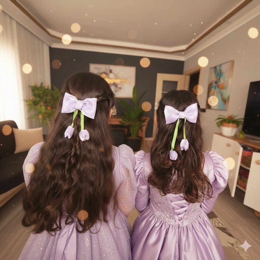 Nakışlı fiyonklu, yeşil kurdele uçlu küçük çiçek detaylı pastel lila saç tokası, bohem ve retro tarzlar için uygun.
