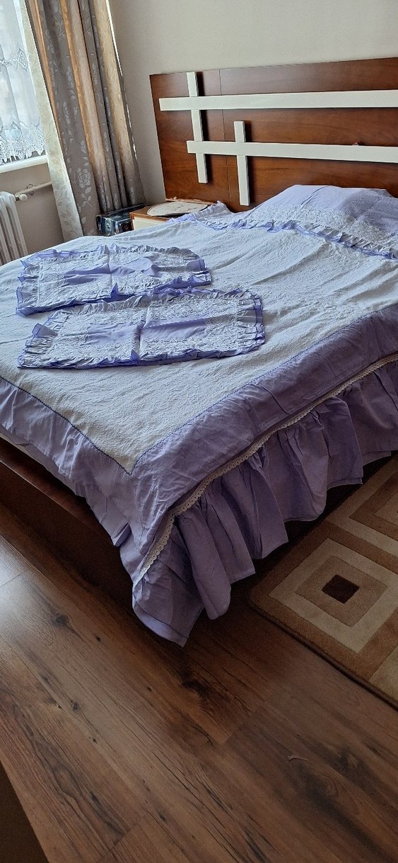 Nakışlı detaylara ve fırfırlı kenarlara sahip pastel lila yatak örtüsü, yatak odasına yumuşak ve zarif bir dokunuş katıyor. ️