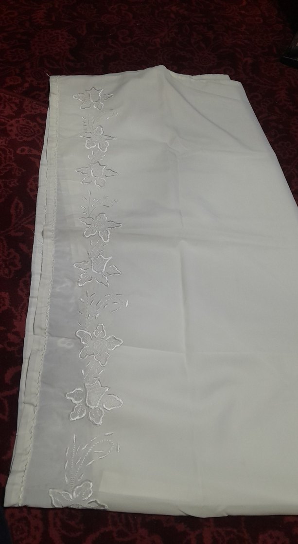 Kenarında nakışlı çiçek desenleri bulunan krem yorgan bandi , klasik tasarıma sahiptir. Yumuşak kumaş ve gri tonlar içerir.